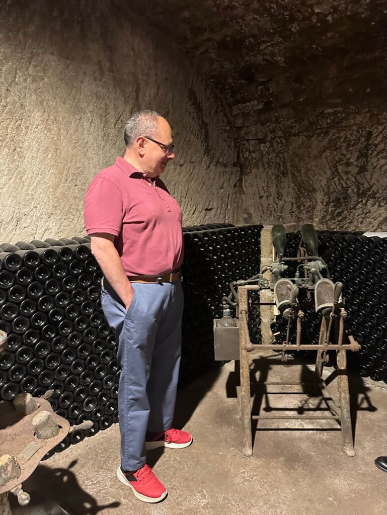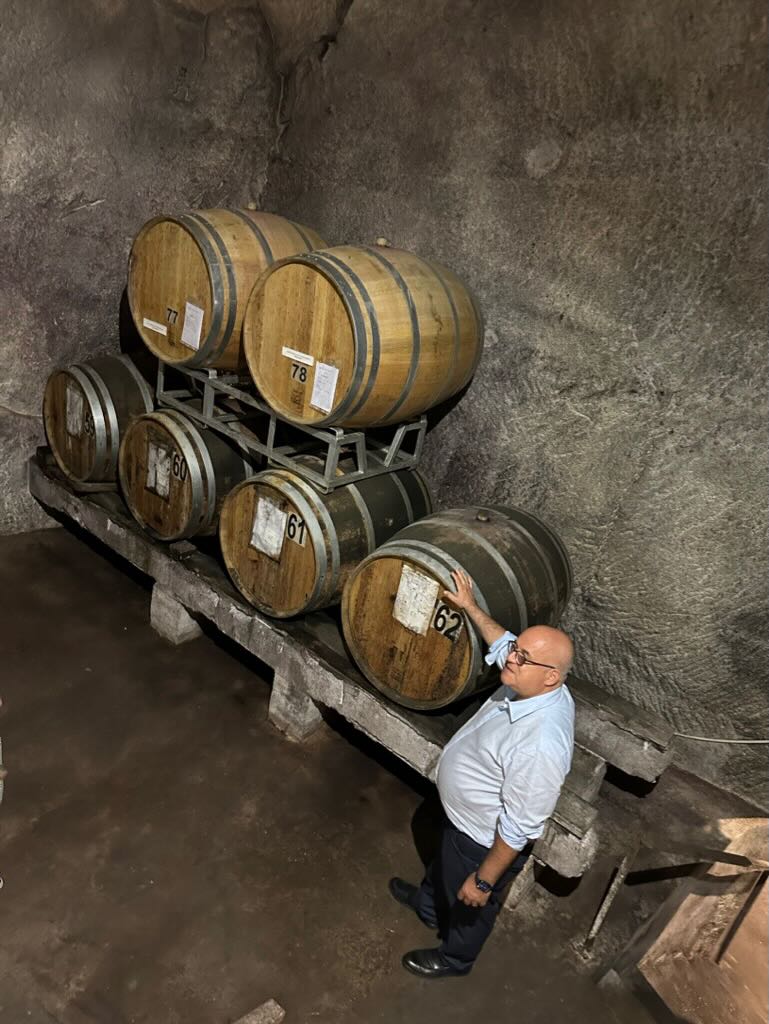 Il nostro secondo viaggio ci porta nel cuore della cantina vera e propria, scavata interamente nel tufo e disposta su più piani, come un labirinto che custodisce segreti e memorie. Ferrante ci guida attraverso i cunicoli, con il passo di chi conosce ogni pietra e ogni angolo, e ci invita a guardare non solo con gli occhi ma con la curiosità di chi entra in una storia viva.