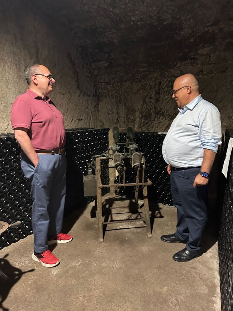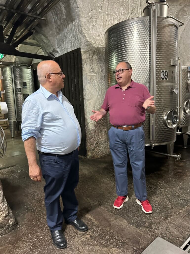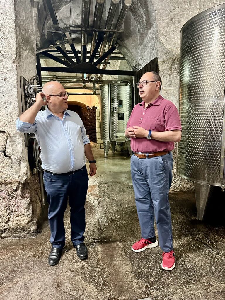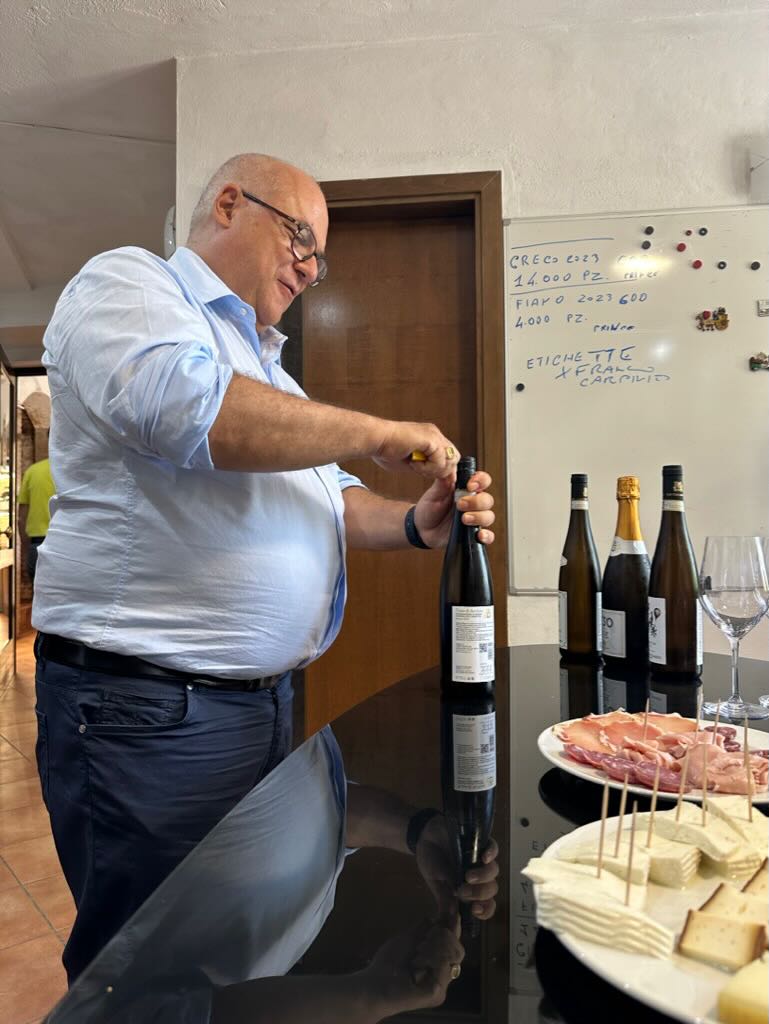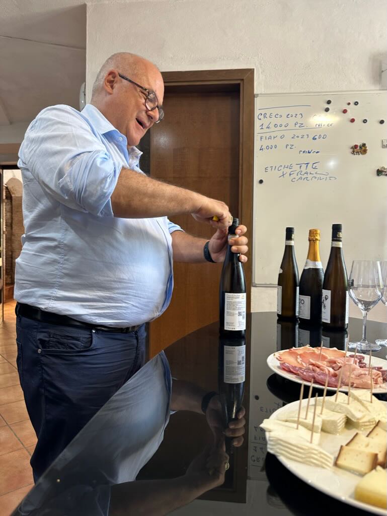 Ad accoglierci con un’ospitalità raffinata e calorosa è proprio Ferrante, figura di grande cultura storica ed enologica, capace di trasformare una visita in un racconto vivido. Prima ancora di portarci tra i vini della sua Cantina, Ferrante ci narra la storia del borgo: la nascita di Tufo, i segni lasciati nei secoli dal suolo sulfureo e dal lavoro dell’uomo. Soprattutto, ci conduce in un viaggio affascinante sull’origine del nome “Greco”, legato a racconti antichi, aneddoti tramandati e studi approfonditi anche con l’aiuto di Antonella Monaco ricercatrice dell’università e grande esperta di commercio medievale del vino e di vitigni, che ha riportato alla luce la memoria storica di un vitigno arrivato da lontano e acclimatatosi perfettamente in Irpinia. Attilio e Ferrante mostrano una tale intesa che, nel raccontare la storia della regione, finiscono per completarsi a vicenda come se avessero studiato insieme.
