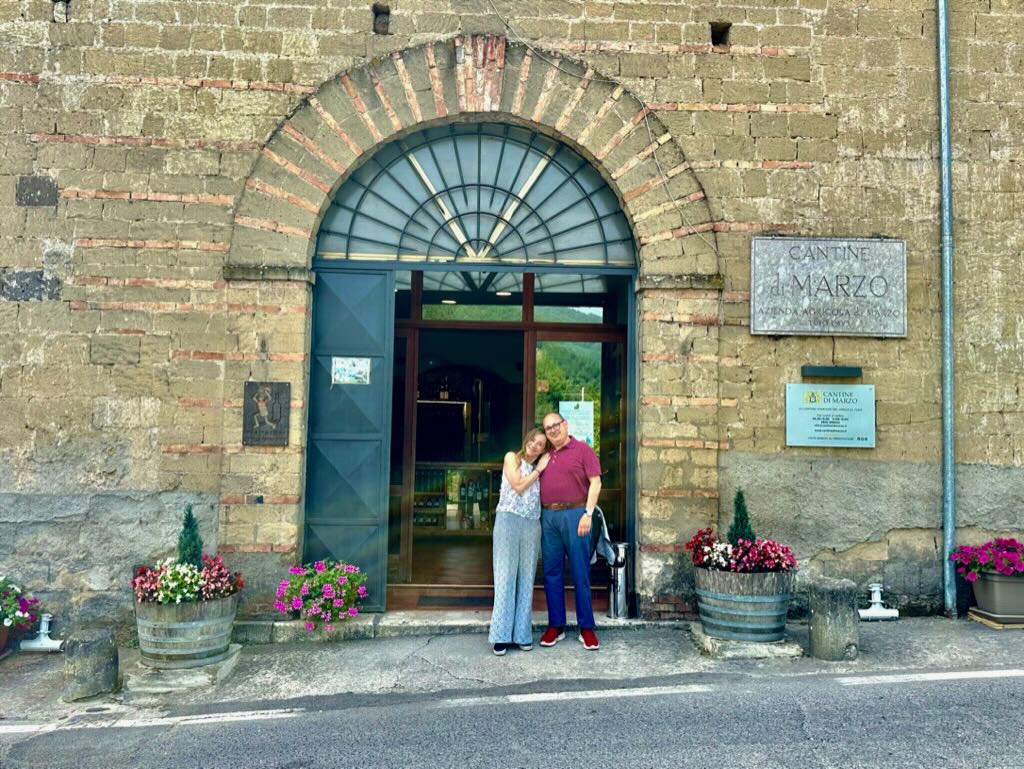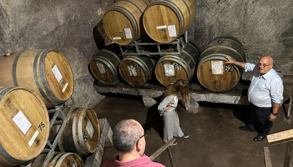 L’azienda che abbiamo visitato è Cantine di Marzo, definita storicamente tra le più antiche del territorio e spesso citata come luogo di origine della produzione organizzata del Greco di Tufo. La famiglia di Marzo vanta radici antiche nella zona e — dopo passaggi e modernizzazioni — oggi la conduzione è nelle mani di Ferrante di Somma (discendente da parte della nonna paterna Maria di Marzo Principessa del Colle) , che ha dato nuova linfa alla tenuta unendo la tradizione secolare a scelte tecniche attente all’internazionalizzazione.