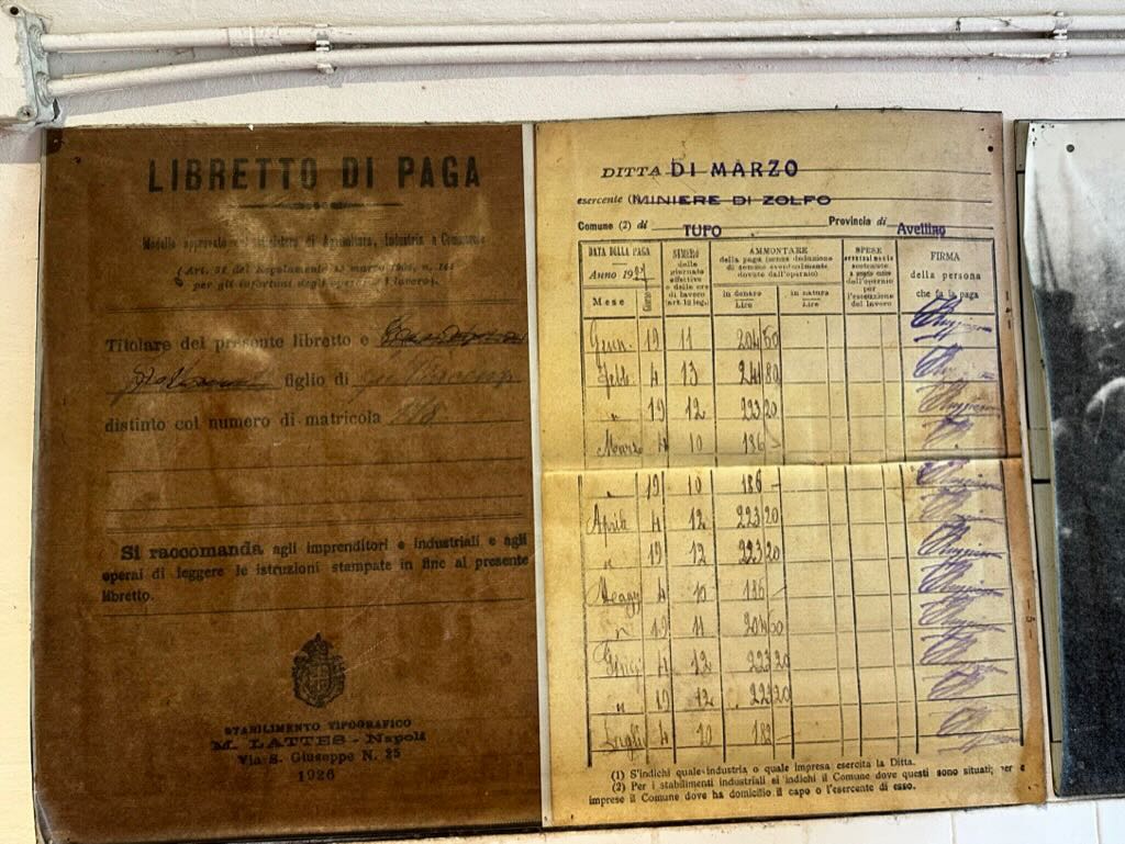 Qui, tra i corridoi freschi e silenziosi, prende forma un piccolo museo: vecchie attrezzature che raccontano di vendemmie lontane, bottiglie conservate di anno in anno come frammenti di tempo sospeso, fotografie e documenti che restituiscono voci e volti. Colpisce la delicatezza di un libro paga del 1927, testimone dell’impegno di un collaboratore, o la presenza di una pietra di zolfo, a ricordare il lavoro nei campi e i gesti quotidiani che accompagnavano la fatica.