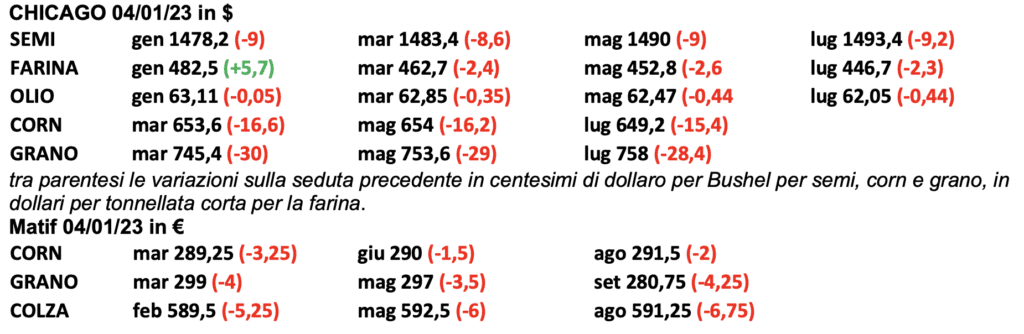 Logicamente la tensione che coinvolge la farina di soya si riverbera su tutto il comparto proteici e semi oleosi. Il 12 gennaio sarà una giornata chiave: USDA con le stime delle produzioni in Sud America e gli stock in USA. Per i cereali segnalo un solo dato: al Bosforo ci sono più navi vuote in entrata che navi piene in uscita, questo per la lunghezza e farraginosità dei controlli. (questa è una notizia che va meditata e che dimostra l’importanza dell’area del Mar Nero). Purtroppo, nel bombardamento di notizie che subiamo quotidianamente la morale è che: bastano poche righe per infiammare i mercati così come bastano poche righe per deprimerli. Siamo sempre nella certezza dell’incertezza anche se la paura della recessione e la calma della Cina nel presentarsi sul mercato stanno dando qualche segnale di rallentamento, ma a noi restano quotazioni troppo alte per una serie di combinazioni mai previste e prevedibili.