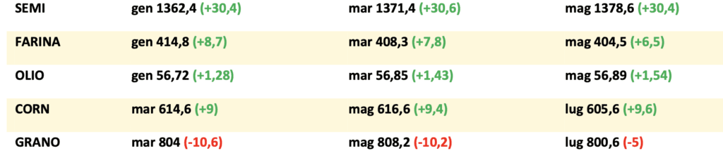 Mario Boggini – esperto di mercati cerealicoli nazionali e internazionali – (per contatti +39 338 6067872) – Valori indicativi senza impegno, soggetti a variazioni improvvise. Questa informativa non costituisce servizio di consulenza finanziaria ed espone soltanto indicazioni-informazioni per aiutare le scelte del lettore, pertanto qualsiasi conseguenza sull’operatività basata su queste informative ricadono sul lettore.