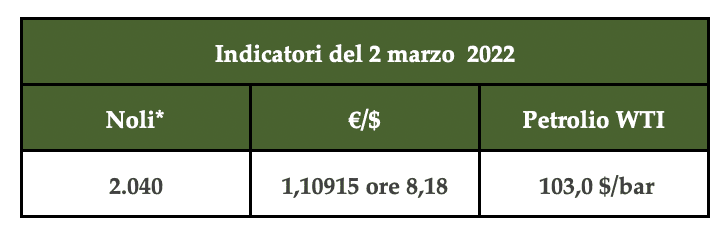L’indice dei noli B.D.Y è sceso a 2.040 punti, il petrolio wti è salito a 103$ al barile, e il cambio gira a 1,10915 ore 8,18
