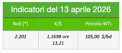 L’indice dei noli b.d.y. è salito a 2.201punti, il petrolio wti è salito a circa 105 $al barile, il cambio €/$ gira a 1,1698 ore 13,21