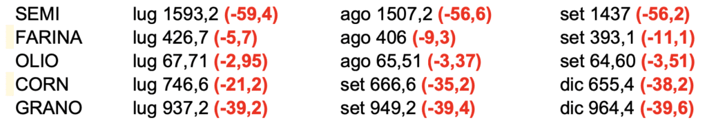 Mario Boggini – esperto di mercati cerealicoli nazionali e internazionali – (per contatti +39 338 6067872) – Valori indicativi senza impegno, soggetti a variazioni improvvise. Questa informativa non costituisce servizio di consulenza finanziaria ed espone soltanto indicazioni-informazioni per aiutare le scelte del lettore, pertanto qualsiasi conseguenza sull’operatività basata su queste informative ricadono sul lettore. Officina Commerciale Commodities srl – Milano
