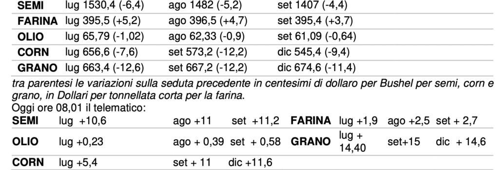 (tra parentesi le variazioni sulla seduta precedente in cent. di dollaro per Bushel per semi corn e grano in Dollari per tonnellata corta per la farina.)