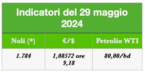 L’indice dei noli b.d.y. è stabile a 1.784 punti, il petrolio wti è salito a circa 80 $ al barile, il cambio €/$ gira a 1,08572 ore 9,18