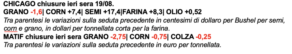 Mario Boggini – esperto di mercati cerealicoli nazionali e internazionali – (per contatti +39 338 6067872) – Valori indicativi senza impegno, soggetti a variazioni improvvise. Questa informativa non costituisce servizio di consulenza finanziaria ed espone soltanto indicazioni-informazioni per aiutare le scelte del lettore, pertanto qualsiasi conseguenza sull’operatività basata su queste informative ricadono sul lettore.