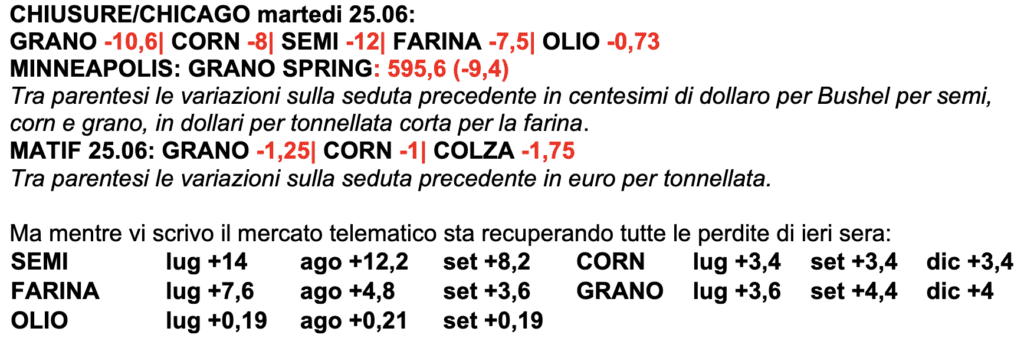 Mario Boggini – esperto di mercati cerealicoli nazionali e internazionali – (per contatti +39 338 6067872) – Valori indicativi senza impegno, soggetti a variazioni improvvise. Questa informativa non costituisce servizio di consulenza finanziaria ed espone soltanto indicazioni-informazioni per aiutare le scelte del lettore, pertanto qualsiasi conseguenza sull’operatività basata su queste informative ricadono sul lettore.