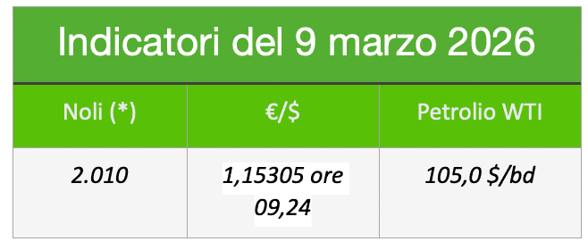L’indice dei noli b.d.y. è incredibilmente sceso a 2.010 punti il petrolio wti è salito a circa 105$ al barile, il cambio €/$ gira a 1,15305 ore 09,24. Lo scivolamento dell’euro continua.