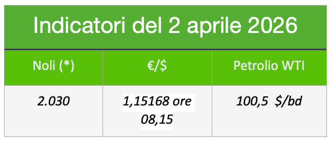 L’indice dei noli b.d.y. è stabile a 2.030 punti, il petrolio wti è stabile a 100$ al barile, il cambio €/$ gira a 1,15168 ore 08,15. (il cambio si è leggermente ripreso dai minimi).