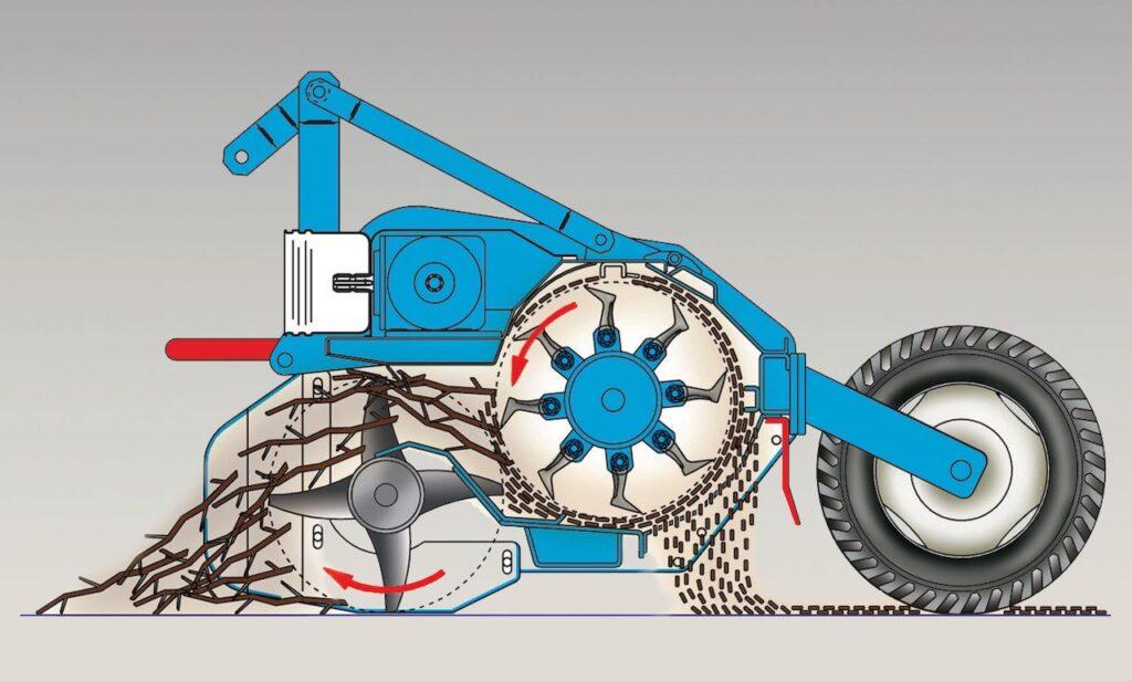 Per mezzo del pick-up raccoglie i residui di potatura sollevandoli e trasportandoli all’interno della camera di trinciatura dove vengono frantumati e successivamente depositati a terra attraverso fori calibrati integrati nel telaio.