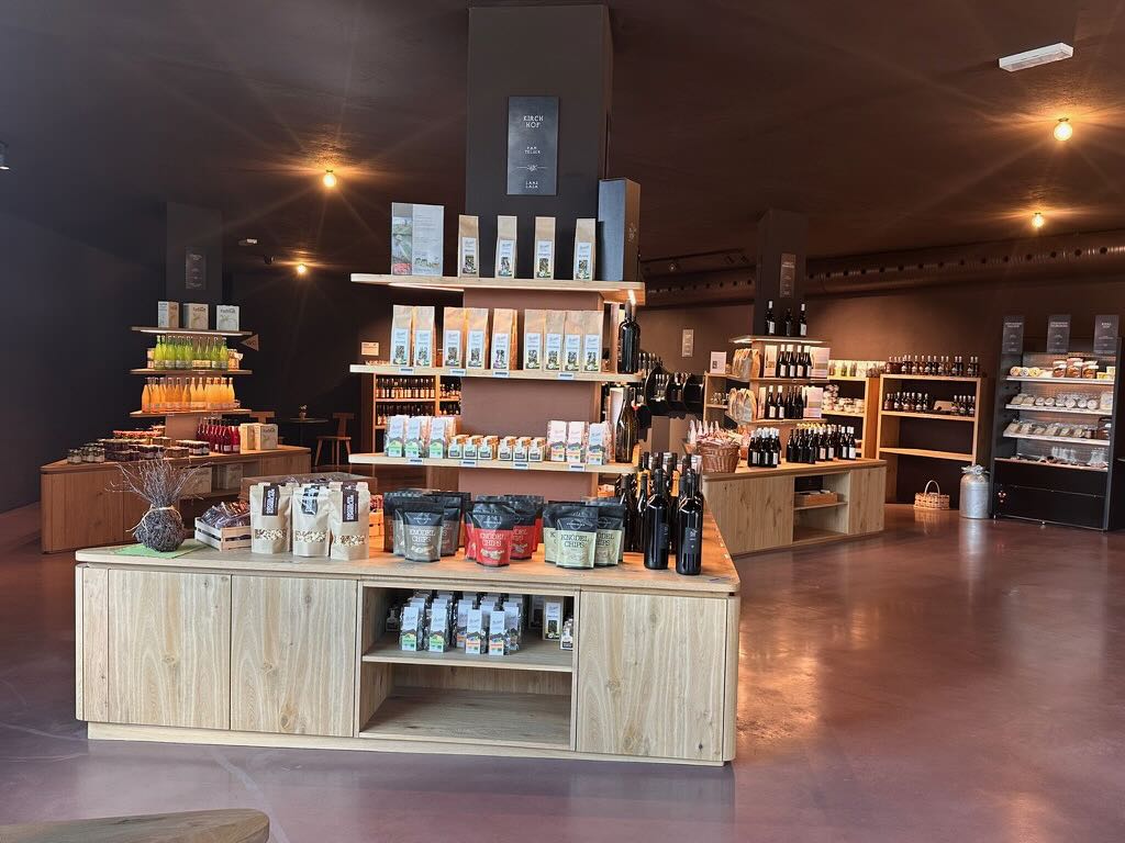 Sugli scaffali ci sono vini, speck, pane, miele, succhi di frutta, conserve.