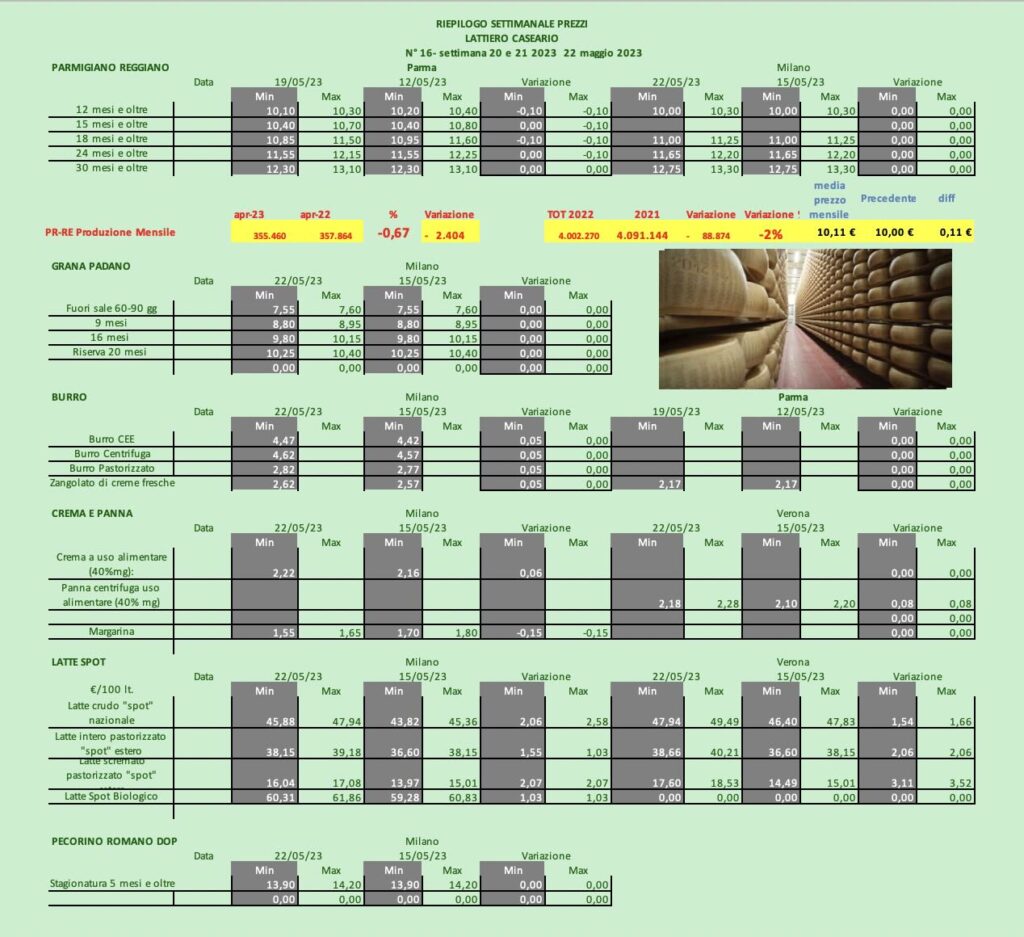 PARMIGIANO REGGIANO – Parma 19 maggio 2023 – A Parma i prezzi sono in flessione. A Milano invece i prezzi si stabilizzano.