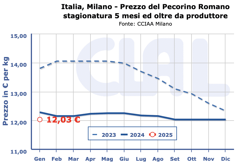 PECORINO ROMANO DOP – Milano 27/1/2025 – A Milano i listini sono stabili da settembre scorso.