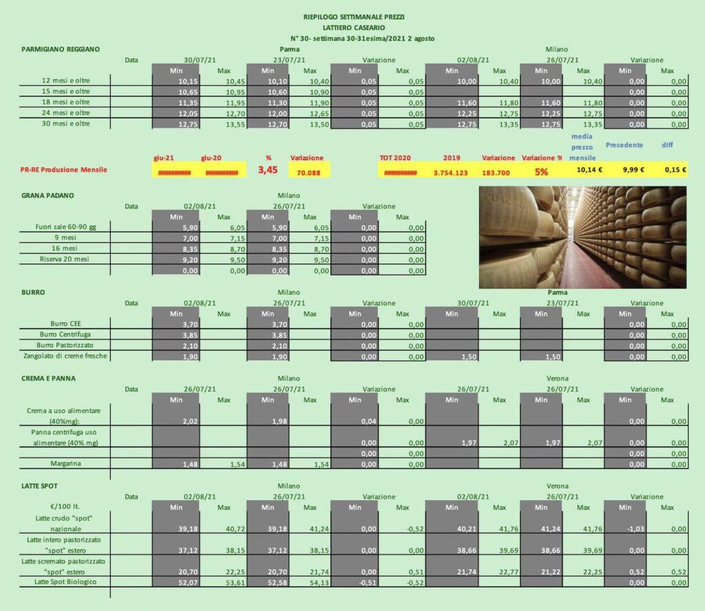 PARMIGIANO REGGIANO – Parma 30 luglio 2021 – A Parma i prezzi hanno ripreso a risalire su tutti i fronti. Anche Milano aggiorna di +5cent/Kg. i listini del Re dei formaggi.