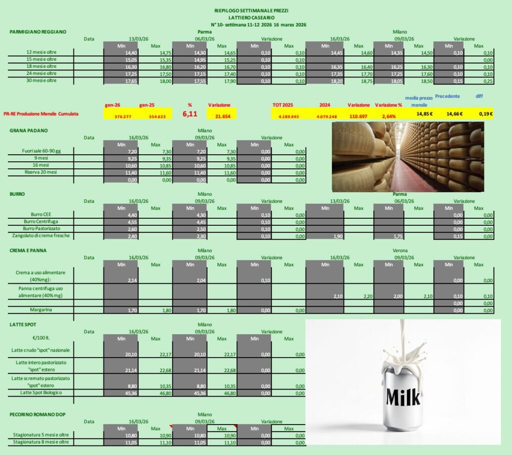 PARMIGIANO REGGIANO – Parma 16/3/2026 – A Parma i listini tornano a crescere (+10cent), e anche alla borsa milanese i prezzi crescono intensamente (+15cent)