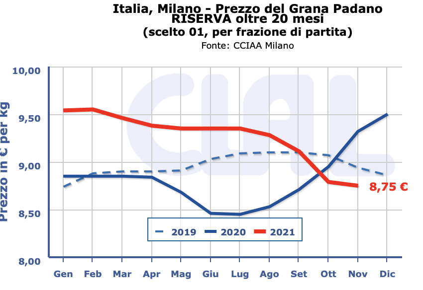 – Grana Padano Riserva 20 mesi di stagionatura e oltre: 8,60 – 8,90 €/Kg. (=)