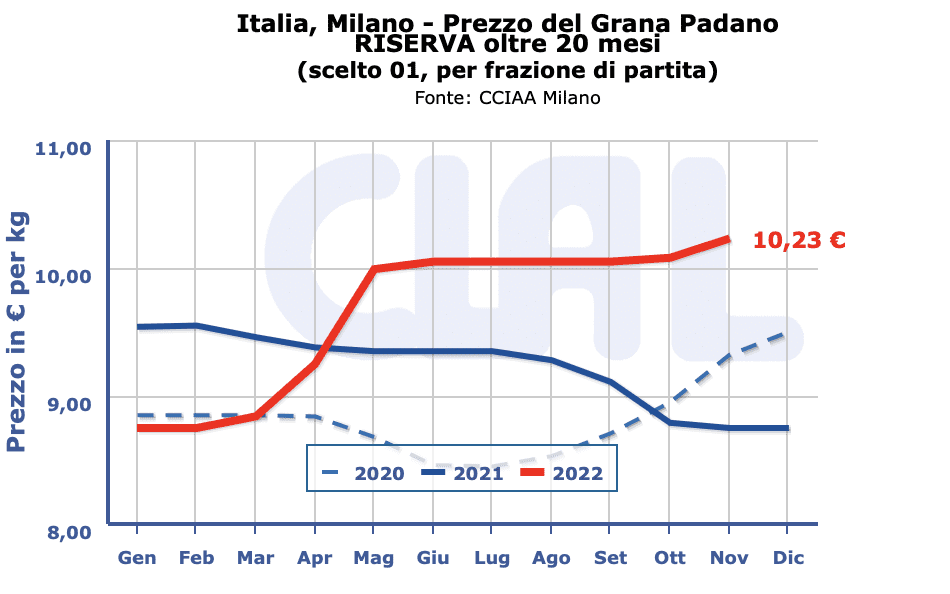 – Grana Padano Riserva 20 mesi di stagionatura e oltre: 10,45 – 10,60 €/Kg. (+)