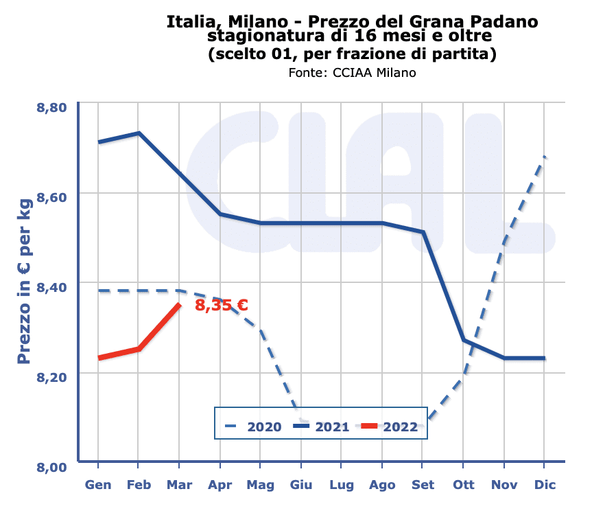 – Grana Padano 16 mesi di stagionatura e oltre: 8,15 – 8,5 €/Kg. (+)