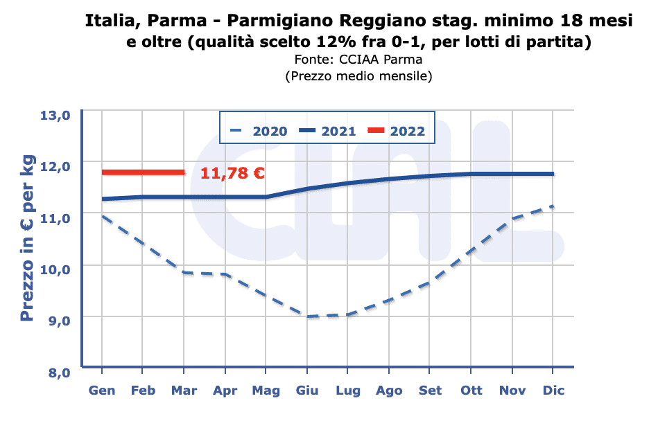 -Parmigiano Reggiano 18 mesi di stagionatura e oltre: 11,45 – 12,10 €/Kg. (=) -11,65 – 11,85 €/kg (+)
