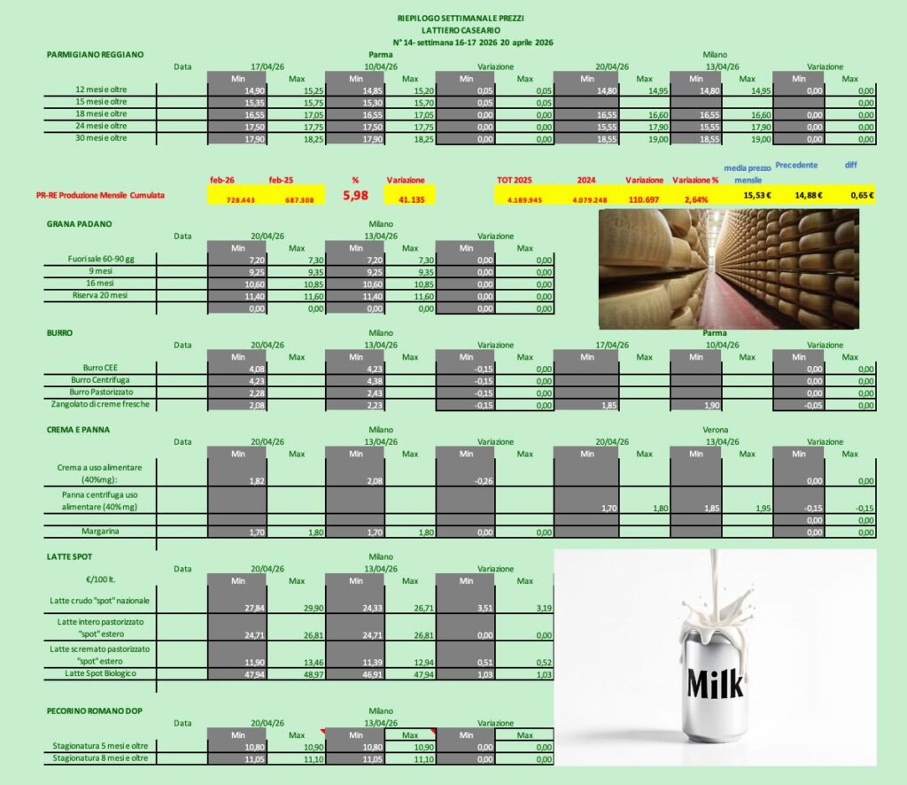 GRANA PADANO– Milano (20/4/2026) – Grana Padano: Ancora Stabile. Dall’inizio del nuovo anno non vi sono state variazioni di prezzo.