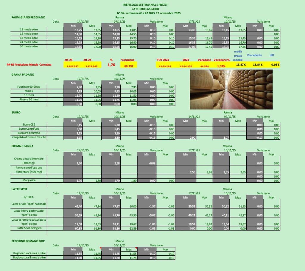 GRANA PADANO– Milano (17/11/2025) – Grana Padano: Torna a calare il prezzo