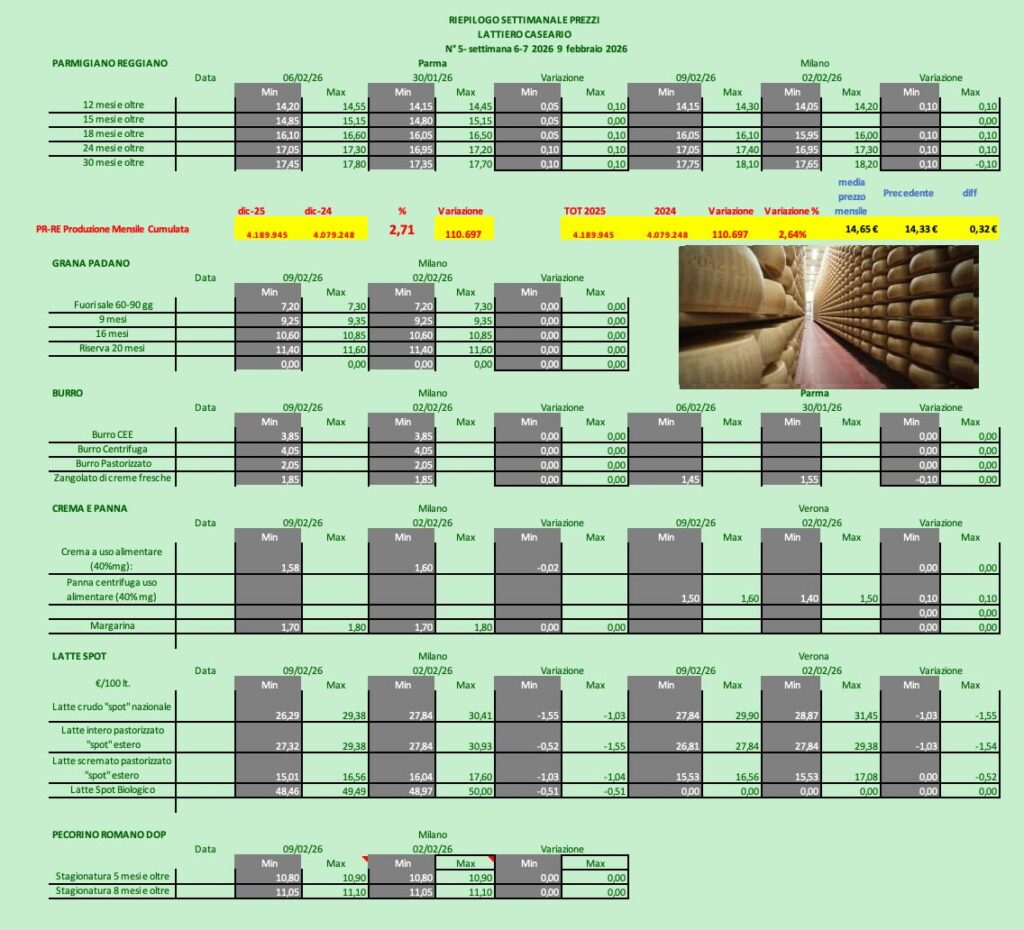 PARMIGIANO REGGIANO – Parma 9/2/2026 – A Parma i listini crescono ancora con maggiore incidenza le 3 stagionature superiori, e alla borsa milanese i prezzi hanno un rimbalzo di 10 cent.