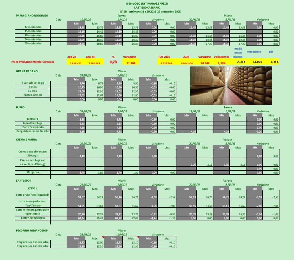 PARMIGIANO REGGIANO – Parma 22/9/2025 – A Parma i listini rallentano confermando le precedenti quotazioni. Altrettanto alla borsa milanese.