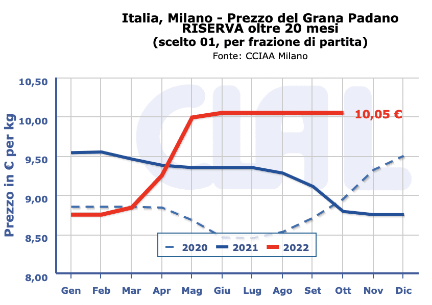– Grana Padano Riserva 20 mesi di stagionatura e oltre: 10,05 – 10,20 €/Kg. (+)