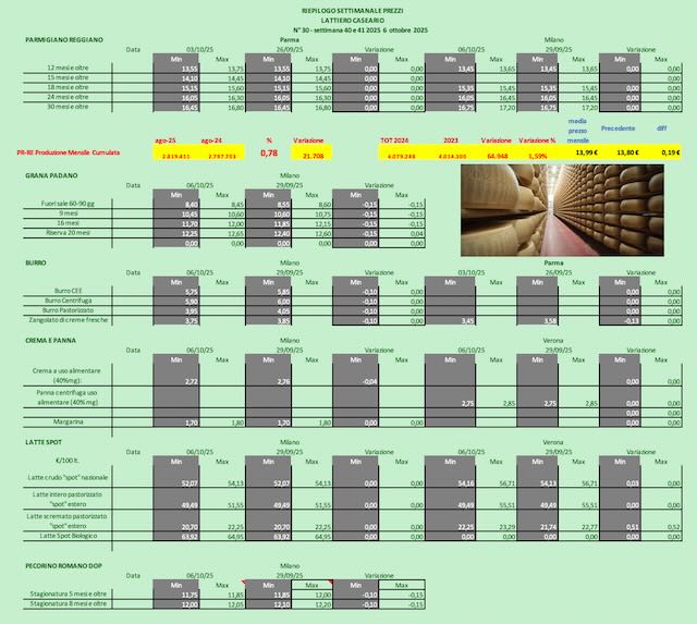 PARMIGIANO REGGIANO – Parma 06/10/2025 – A Parma i listini rallentano confermando le precedenti quotazioni. Altrettanto alla borsa milanese.