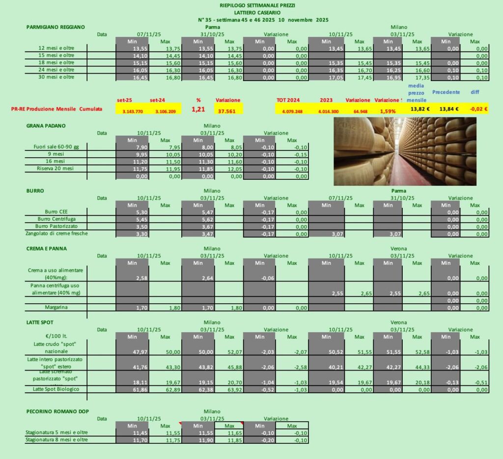 GRANA PADANO– Milano (10/11/2025) – Grana Padano: Torna a calare il prezzo