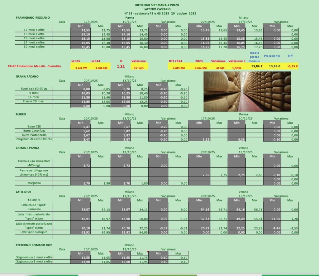 PARMIGIANO REGGIANO – Parma 20/10/2025 – A Parma i listini rallentano confermando le precedenti quotazioni. Altrettanto alla borsa milanese.