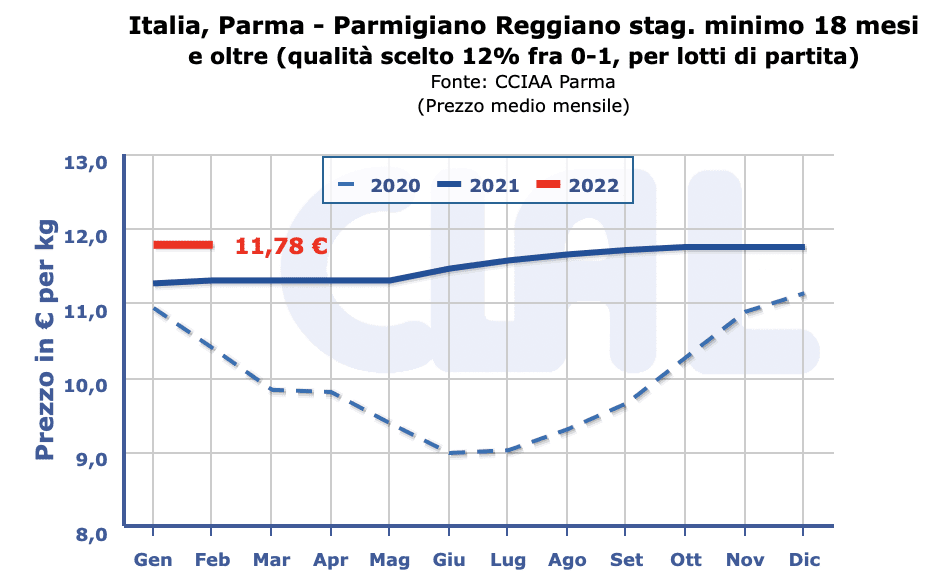 PARMIGIANO REGGIANO – Parma 25 febbraio 2022 – A Parma i prezzi sono ancora stabili e altrettanto a Milano.