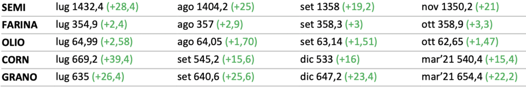 La causa? Il calo dei suoi stock scesi a 18 milioni di tonnellate contro i 21 milioni di giugno, ma specialmente contro i 23 della campagna precedente. Logicamente tale fattore, con gli stock già bassi di Corn-mais e di semi di Soya, non poteva che dare spazio alla speculazione.