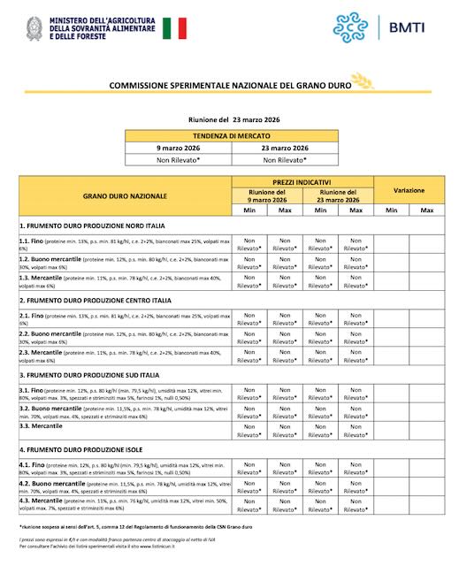 La CUN avrà il compito di individuare il prezzo indicativo del grano duro nazionale e le relative tendenze di mercato, interrompendo le vecchie quotazioni di Foggia e Bologna, con l’ulteriore elemento di grande rilievo che è rappresentato dalla nuova struttura del listino nazionale differenziato per qualità: fino alto proteico (15% di proteine), fino proteico (14%), fino (13% al Nord, 12% al Sud) e convenzionale (11,5%). Si tratta di un’evoluzione significativa, che consente di leggere in maniera più puntuale e realistica il mercato del grano duro, valorizzando le diverse caratteristiche qualitative delle produzione.