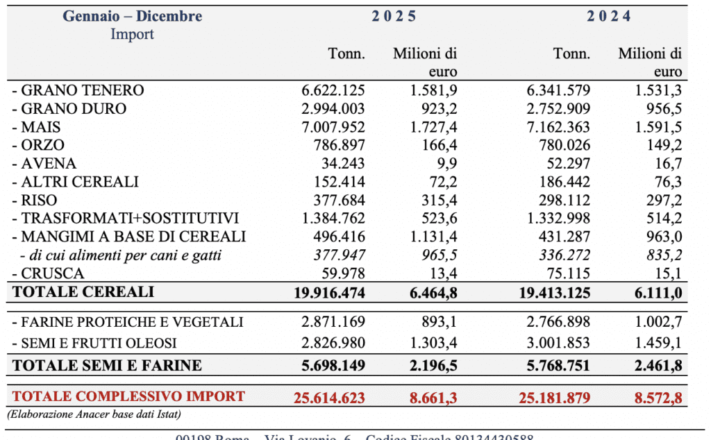 “In Italia – scrive ANACER lo scorso 13 marzo – nel corso del 2025, secondo i dati ANACER, sono arrivate quasi 3 milioni di tonnellate in più rispetto all’anno precedente di Grano Duro (+8,76%).