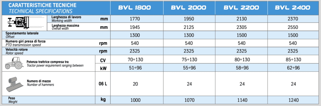 I Triturator BV BVR sono costruiti con acciaio ad alta resistenza, mazze pesanti con un nuovo design, tre controcoltelli di serie e hanno la possibilità di avere i denti di raccolta per agevolare la triturazione dei sarmenti. La gamma BV si divide nelle due linee serie 10 e serie 100.