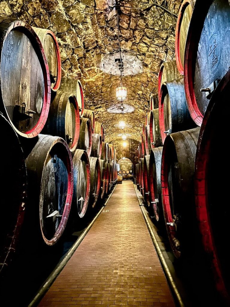 La visita al museo prosegue attraverso le cantine storiche costruite con pietre di porfido con un corridoio tracciato tra grandi botti in rovere, una luce fioca ci conduce alla cantinetta dove riposano bottiglie storiche dell’azienda.