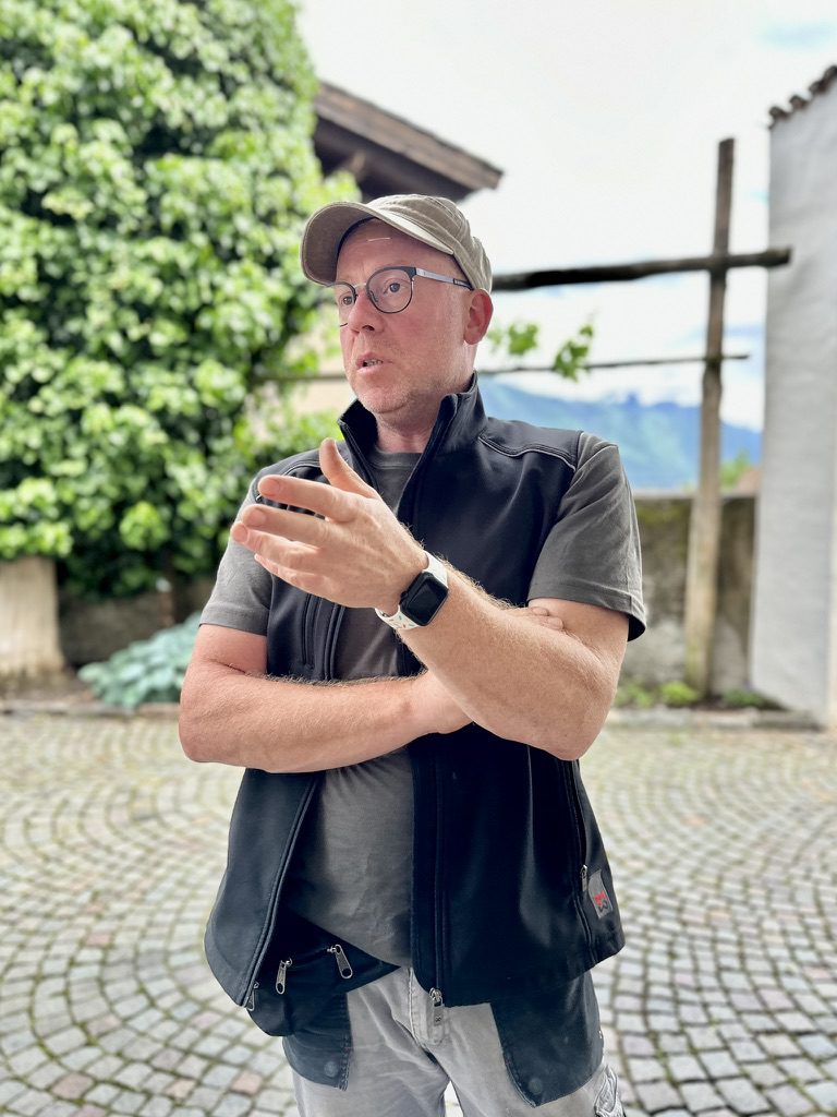 Erwin continua nel suo racconto ed evidenzia che al Pardellerhof vengono coltivati Moscato Giallo, Sauvignon Blanc, Pinot Grigio e diverse varietà PIWI (acronimo di pilzwiderstandfahig, ovvero varietà resistenti ai funghi) tra cui anche Bronner. Questi appezzamenti sono esposti a sud-est, piuttosto ripidi ma accessibili. Sono posizioni più fresche che producono vini aromatici freschi con un gusto deciso e un’eleganza raffinata. La collina dove cresce il Vernatsch è invece esposta a sud ed è molto più calda, porta il nome “Herrenleit”. Le viti sono coltivate con il sistema tradizionale della pergola e tutto il lavoro nel vigneto viene svolto a mano. A quote più basse, sulla collina in declivio, crescono Lagrein, Merlot e Tannat. Le uve vengono lavorate nella cantina del maso ed i vini vengono conservati in botti di acciaio o in legno fino all’imbottigliamento.