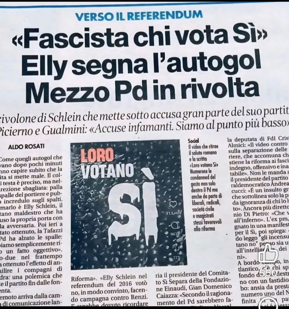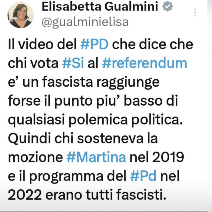 Non da meno l’altra piddina DOC Elisabetta Guelmini che osserva che “Il video del #PD che dice che chi vota #Si al #referendum e’ un fascista raggiunge forse il punto più basso di qualsiasi polemica politica. Quindi chi sosteneva la mozione #Martina nel 2019 e il programma del #Pd nel 2022 erano tutti fascisti”.