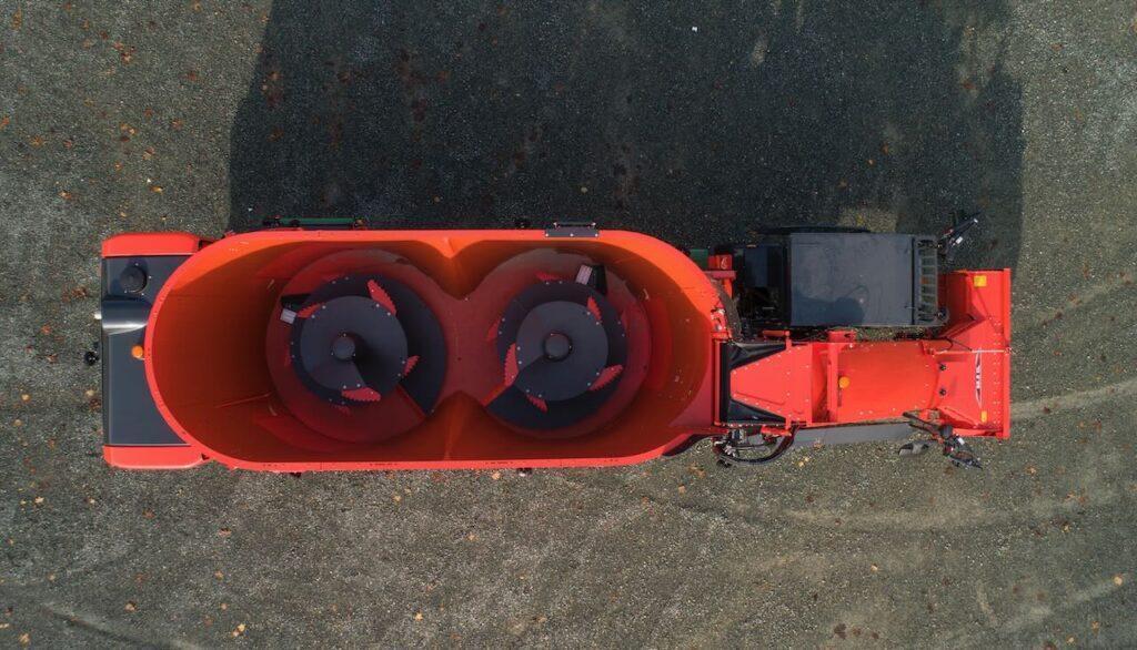 Il carico è gestito da una fresa per insilati larga 2000 mm con una potenza di 200 HP, garantendo così un rapido riempimento della vasca di miscelazione.