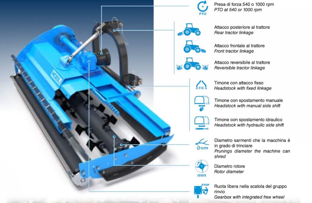Sviluppati in tre serie 10, 100 e 1000 che definiscono caratteristiche crescenti per telaio, sia in termini di dimensioni che larghezze di lavoro, oltre che prestazioni crescenti nella combinazione di mazze/coltelli e controcoltelli. La serie 10, normalmente impiegata in vigneti e frutteti stretti, è adatta per erba e sarmenti. Passando alla serie 100 si aumenta il diametro di taglio e la robustezza strutturale, ciò consente l’aumento delle larghezze di lavoro e capacità di trinciare sarmenti fino a 8 cm. Il livello maggiore, serie 1000, è caratterizzato dall’impiego di componenti superdimensionati, un esempio sono le mazze da 2,2 kg e supporti dentati sul rotore che consentono di triturare grossi sarmenti di potatura fino a 10 cm di diametro.