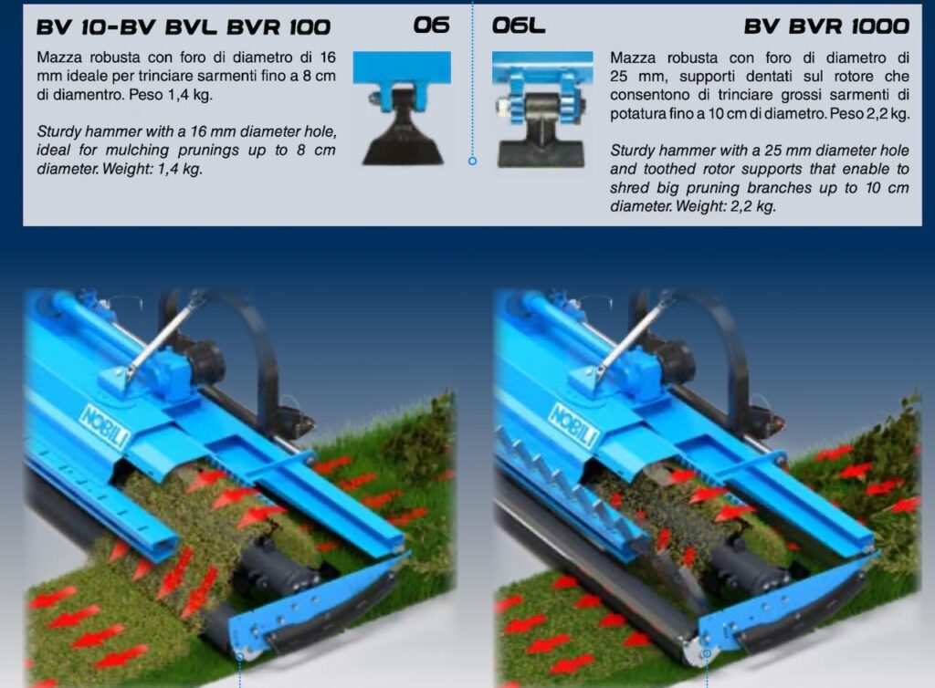 I triturator BV, BVL e BVR di Nobili sono trinciasarmenti pensate per l’utilizzo in vigneto, frutteto e oliveto. Sono contraddistinte da un profilo arrotondato, trasmissione ribassata e compatta, telaio realizzato con acciai alto resistenziali in doppia cassa (parziale o totale); montano utensili pesanti e dotate di 3 file di controcoltelli.
