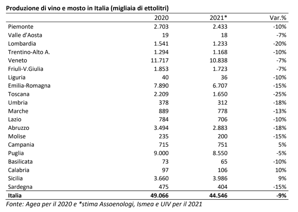 (Roma, 8 settembre 2021). Poca ma buona, a tratti ottima, in un contesto di mercato in forte ripresa. Scende a 44,5 milioni di ettolitri la produzione nazionale di vino 2021, un dato in calo del 9% rispetto ai 49 milioni di ettolitri del 2020 (dato Agea) che, nonostante la contrazione determinata dalle anomalie di un meteo sempre più protagonista, non scalfisce il primato produttivo tricolore in un’annata che vede la Spagna ferma attorno ai 40 milioni di ettolitri e la Francia penalizzata da un andamento climatico particolarmente avverso. Secondo le previsioni vendemmiali di Assoenologi, Ismea e Unione italiana vini, presentate oggi nel corso di una conferenza stampa online alla presenza anche del sottosegretario alle Politiche agricole, alimentari e forestali, Gianmarco Centinaio, il vigneto Italia resiste e si presenta in buone condizioni non solo all’appuntamento con la vendemmia, ma anche sul fronte cruciale della ripartenza, con segnali incoraggianti sia dalla domanda estera (2,7 miliardi di euro e +11% il risultato dell’export nei primi 5 mesi dell’anno) che sul mercato interno, trainato dalla riapertura dell’Horeca e dalla ripresa del turismo. Dopo una campagna 2020/21 con i prezzi in flessione del 3% (indice Ismea rispetto alla campagna precedente), la prospettiva di una minor produzione per la vendemmia in corso, assieme alla ritrovata dinamicità della domanda, genera ottimismo anche sull’andamento futuro dei listini.